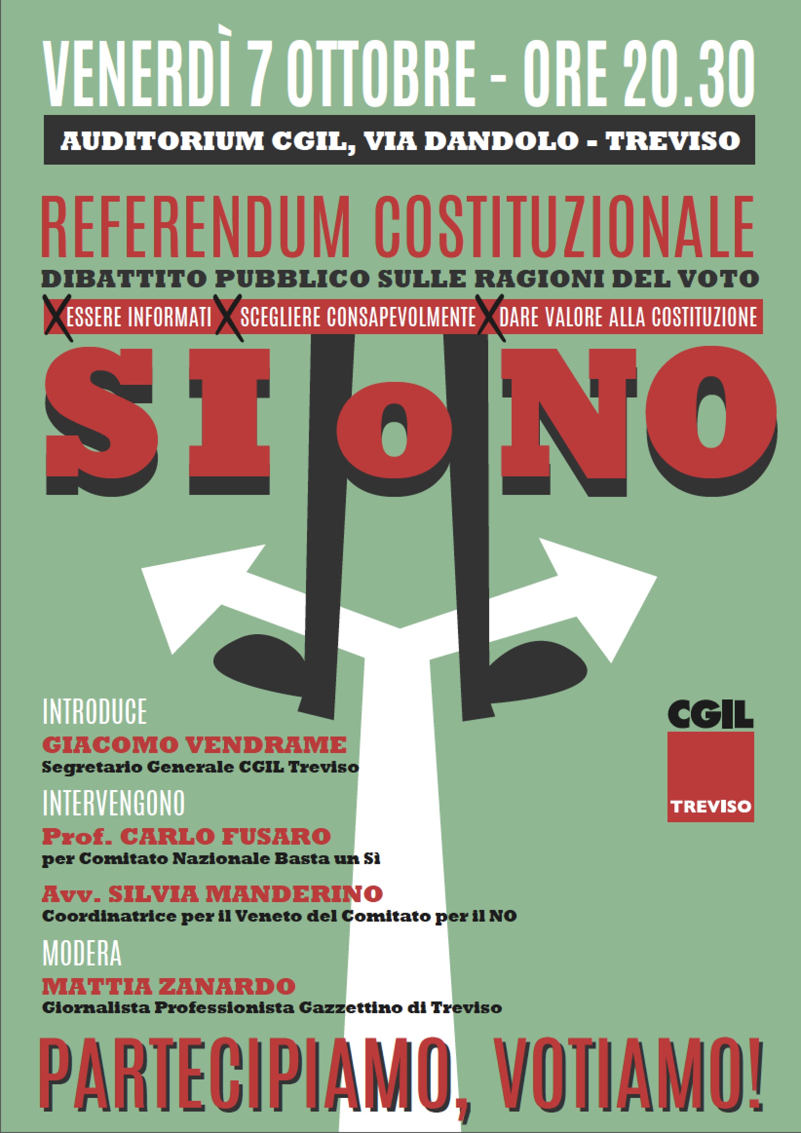 Allo scopo di informare la cittadinanza e stimolare una scelta consapevole, la CGIL promuove per venerdì 7 ottobre, alle ore 20:30 nell’Auditorium di via Dandolo a Treviso, un dibattito pubblico sul referendum costituzionale. All’appuntamento interverranno il prof. Carlo Fusaro per il Comitato Nazionale “Basta un Si” e l’avv. Silvia Manderino, Coordinatrice per il Veneto del Comitato per il No. Introduce la serata Giacomo Vendrame, segretario generale CGIL Treviso, modera l’incontro Mattia Zanardo, giornalista.