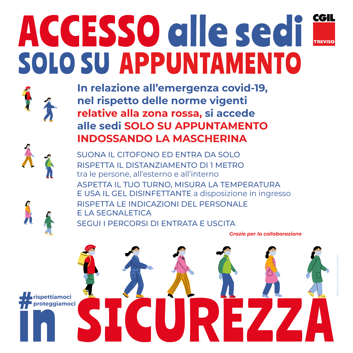 Nel rispetto delle norme vigenti relative alla "zona rossa" e delle disposizioni per garantire la sicurezza del pubblico e degli operatori, fino a nuove disposizioni l'accesso alle sedi CGIL della provincia di Treviso è gestito unicamente su appuntamento, con l'obbligo di indossare la mascherina e il divieto di formare assembramenti e di recarsi nelle sedi in caso di sintomatologie. Chi è in possesso di regolare appuntamento deve riportare l'indirizzo della sede e il motivo dello spostamento nel modulo di autocertificazione.