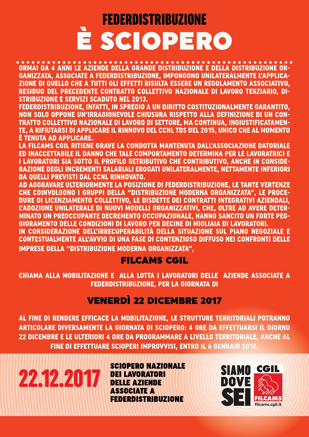 Federdistribuzione: Ormai da 4 anni, le aziende della Grande Distribuzione Organizzata associate a Federdistribuzione impongono unilateralmente l’applicazione di quello che a tutti gli effetti risulta essere un regolamento associativo, residuo del precedente Contratto Collettivo Nazionale di Lavoro Terziario, Distribuzione e Servizi scaduto nel 2013. L’associazione datoriale disconoscendo quanto garantito da disposizioni costituzionali in materia, non solo si rifiuta di definire un Contratto Collettivo Nazionale di Lavoro di settore, tanto da aver cessato ogni trattativa, ma continua a rendersi indisponibile anche ad applicare il rinnovo del Contratto Nazionale Confcommercio del 2015, determinando per le lavoratrici e i lavoratori un danno sia dal punto di vista retributivo che contributivo.