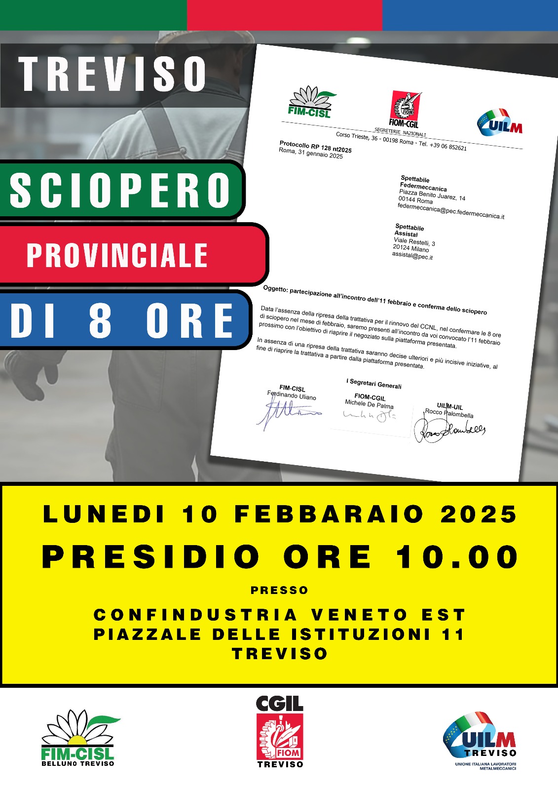 “Federmeccanica e Assistal fino ad oggi non hanno rispettato lavoratori e i sindacati che li rappresentano presentando un’assurda quanto inaccettabile controproposta - affermano i segretari di FIOM CGIL Treviso, FIM CISL Belluno Treviso e UILM UIL Veneto Treviso, rispettivamente Manuel Moretto, Alessio Lovisotto e Stefano Bragagnolo -. In questo contesto economico, sociale e geopolitico chi blocca la trattativa si assume la responsabilità di aggravare la situazione dei lavoratori dell’industria”.