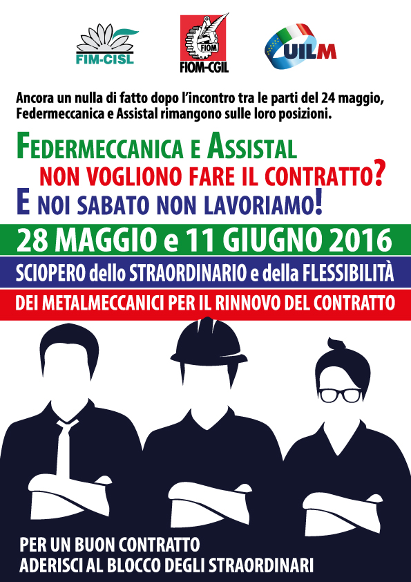 Dopo che nel corso dell’incontro dello scorso 24 maggio con i Sindacati di categoria le parti datoriali hanno di fatto impedito l’avvio di un vero negoziato, le segreterie nazionali di Fiom, Fim e Uilm hanno proclamano lo sciopero dello straordinario e della flessibilità per lo scorso 28 maggio e per sabato 11 giugno e un pacchetto di 12 ore di sciopero, 4 gestite a livello aziendale e 8 ore il 9 giugno, giornata della manifestazione regionale di Vicenza.