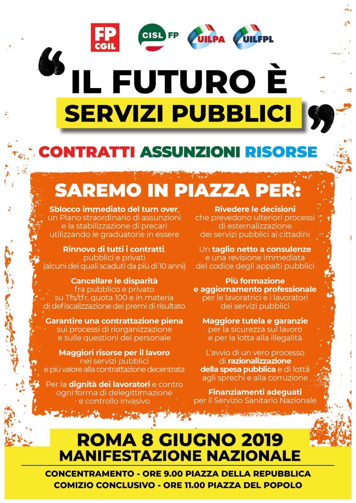 #futuroèpubblico è lo slogan scelto. Molte le rivendicazioni: lo sblocco immediato del turn-over, un piano straordinario di assunzioni e la stabilizzazione di precari, il rinnovo di tutti i contratti pubblici e privati, il cancellamento delle disparità nel sistema previdenziale sia nel settore pubblico riguardo al trattamento di fine rapporto, sia su Quota 100 e sui lavori gravosi, la garanzia di una contrattazione sui processi di riorganizzazione e sulle questioni del personale per dare più valore alla contrattazione decentrata e tutelare la dignità dei lavoratori, maggiori investimenti nei servizi pubblici per contrastare i processi di esternalizzazione dei servizi che determinano dumping contrattuale e mancata universalità dei diritti per i cittadini.