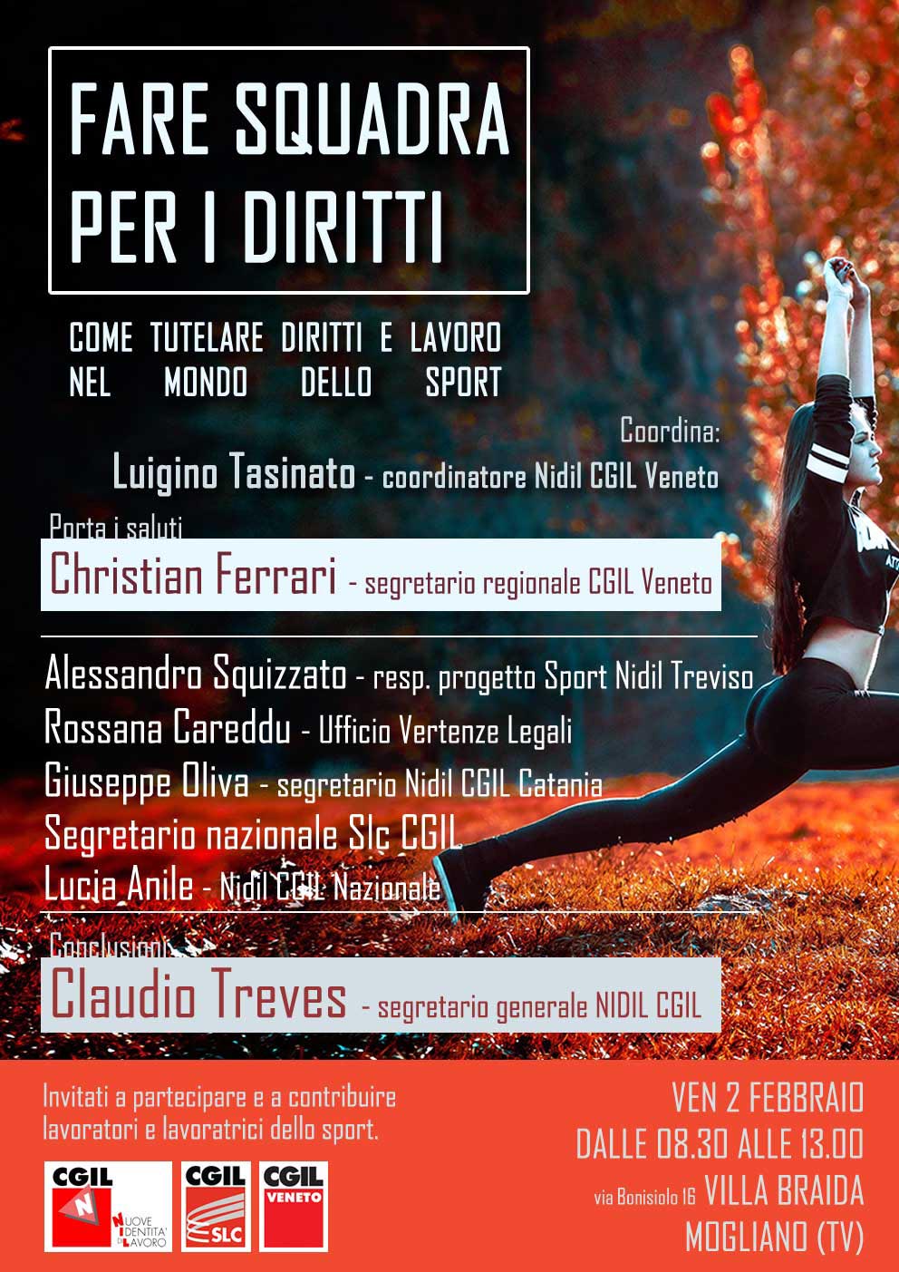 Sindacalisti e operatori del settore dello sport si sono dati appuntamento per venerdì 2 febbraio dalle ore 8.30 alle 13, a Villa Braida di Mogliano, per un momento di approfondimento e di indirizzo sul tema delle collaborazioni sportive e per riflettere sul pericolo di sfruttamento dei lavoratori che in questo mondo sta emergendo con forza. L’iniziativa, intitolata “Fare squadra per i diritti, come tutelare diritti e lavoro nel mondo dello sport”, è organizzata da NIDIL CGIL Veneto, la categoria dei lavoratori atipici, in collaborazione con SLC e CGIL regionali.