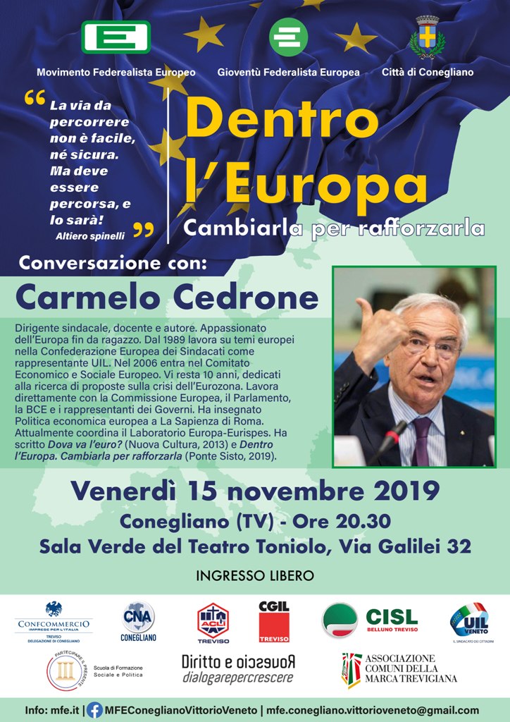 “Dentro l’Europa. Cambiarla per rafforzarla”. È il titolo dell’iniziativa organizzata dal Movimento Federalista Europeo (MFE) e dalla Gioventù Federalista Europea (GFE), sezioni di Conegliano-Vittorio Veneto, con il patrocinio del Comune di Conegliano e insieme a numerosi partner, venerdì 15 novembre alle 20.30, presso la Sala Verde del Teatro Toniolo (via Galilei 32).