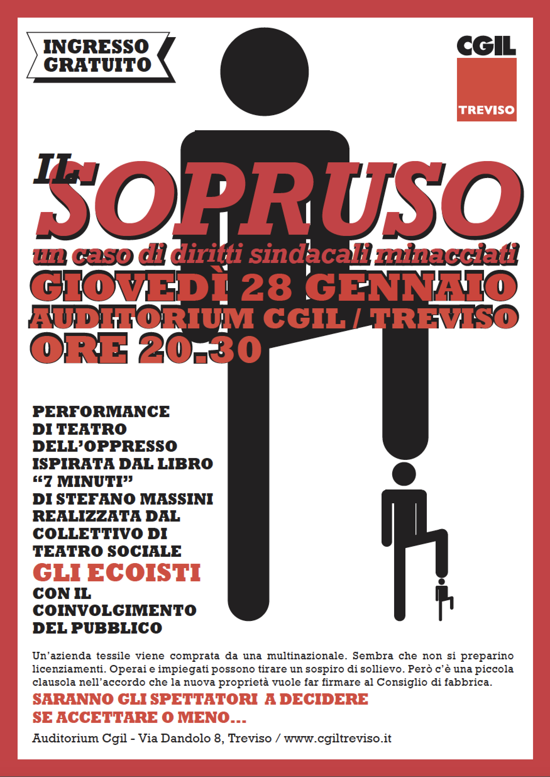 Giovedì 28 gennaio alle 20.30 presso l’Auditorium della CGIL a Treviso di via Dandolo il Collettivo di teatro sociale GLI ECOISTI porterà in scena IL SOPRUSO, una performance che farà rivivere un episodio di diritti sindacali violati realmente accaduto perché ne sia individuata, con il coinvolgimento del pubblico, una possibile soluzione.