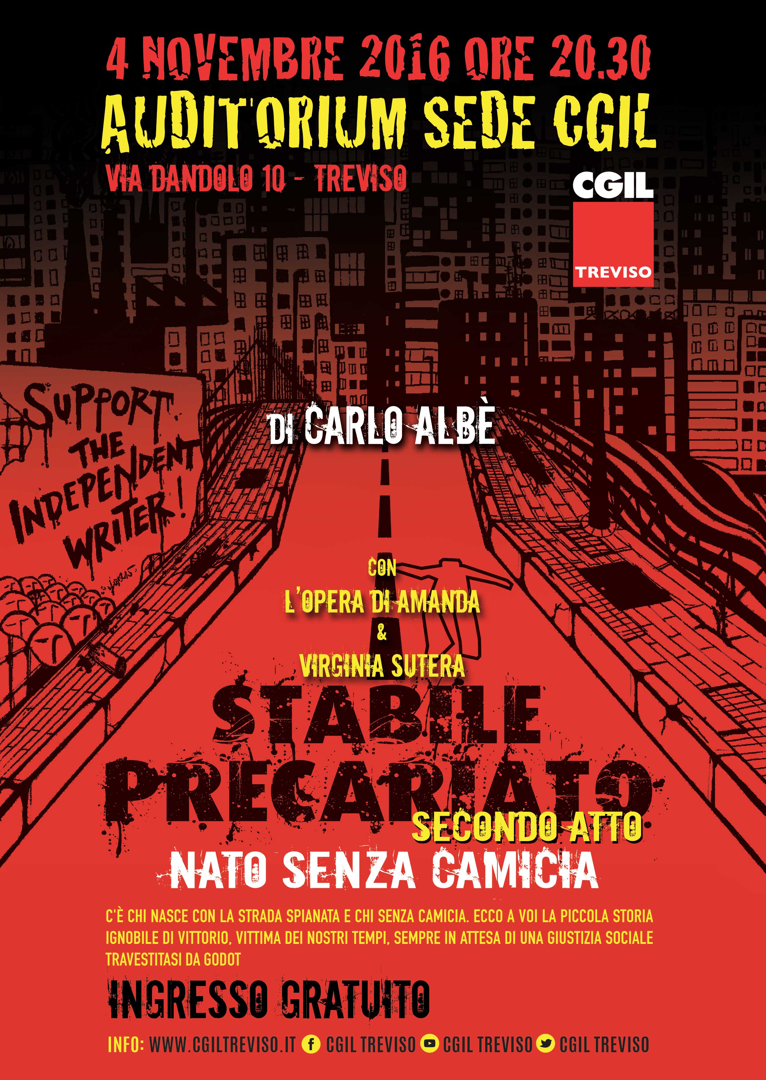 Prosegue il racconto della piccola storia ignobile di Vittorio, un ragazzo che, “Nato senza camicia”, vive solo all’estrema periferia nord di Milano. Carlo Albè, autore di “Stabile precariato”, torna a Treviso ospite della CGIL, venerdì 4 novembre 2016, alle ore 20:30 nell’Auditorum di via Dandolo, con il secondo atto del suo reading: uno spaccato della vita dei giovani lavoratori di oggi, per i quali la dimensione del precariato si è “stabilizzata”, senza via di fuga. Perché se c’è chi viene al mondo già con la strada spianata, chi invece nasce senza camicia rischia di rimanere come Vittorio, vittima dei nostri tempi e in perenne attesa di una giustizia sociale che fatica proprio ad arrivare. Ingresso gratuito.