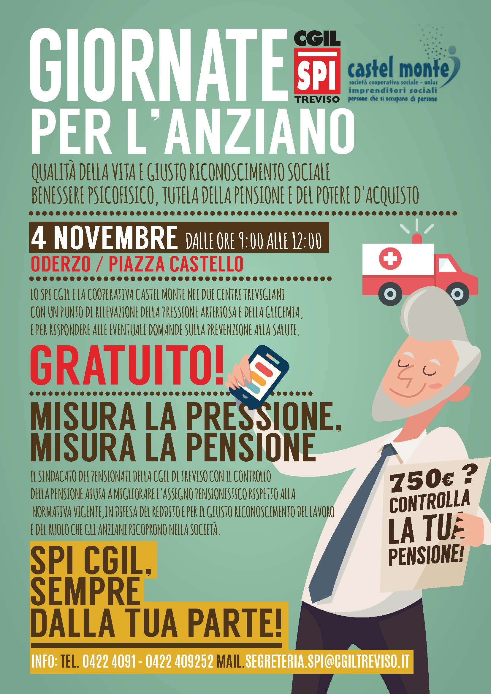 Le Giornate per l’Anziano sono in programma mercoledì 4 novembre a Oderzo, dalle 9.00 alle 12.30 in piazza Castello, giovedì 5 novembre, con gli stessi orari, a Preganziol vicino alla Chiesa di Sant’Urbano (fianco area mercato) e lunedì 9 novembre, dalle 9 alle 12, in piazza 2 giugno a Roncade. Pressione e glicemia sono importanti fattori che permettono di godere di buona salute. Personale specializzato della Castel Monte provvederà gratuitamente alle misurazioni e a rispondere alle eventuali domande sulla prevenzione. Inoltre, al fine di migliorare l’assegno pensionistico rispetto alla normativa vigente, in difesa del reddito e per il giusto riconoscimento del lavoro e del ruolo che gli anziani ricoprono nelle nostre comunità, lo SPI CGIL continua a promuovere il controllo della pensione sul territorio trevigiano.