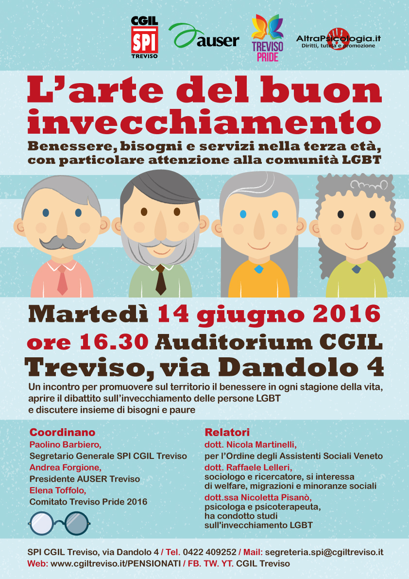 Nell’ottica di proseguire il percorso che già lo scorso anno ha visto quattro appuntamenti pubblici su sessualità e alimentazione degli anziani, oltre alle iniziative sul controllo della salute, martedì 14 giugno alle ore 16:30 presso l’Auditorium CGIL di via Dandolo, lo SPI di Treviso promuove l’incontro "L’arte del buon invecchiamento. Benessere, bisogni e servizi nella terza età con particolare attenzione alla comunità LGBT", organizzato insieme al Comitato Treviso Pride 2016, Auser e AltraPsicologia.
